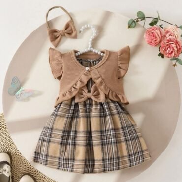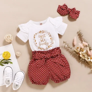 طقم بناتي أنيق وجذاب مكون من بوديسوت مكشكش وشورت مزين بفيونكة مع ربطة شعر