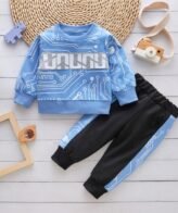 طقم ولادي مكون من قطعتين جاكيت مع قبعة وبنطلون بقبضة من الأسفل بتصميم حديث وعصري.