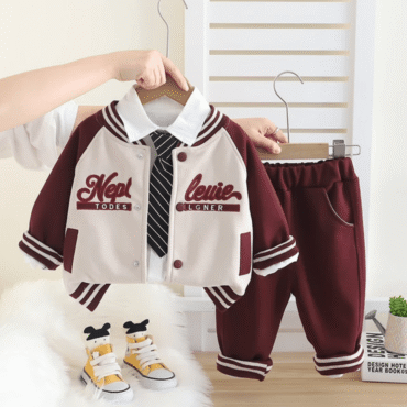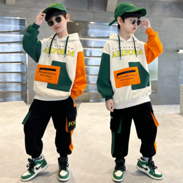 طقم ولادي مكون من قطعتين جاكيت مع قبعة وبنطلون بقبضة من الأسفل بتصميم حديث وعصري.