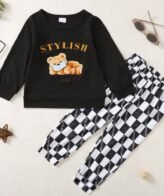 طقم ولادي مكون من بلوفر مخطط وشيال بنمط دب.