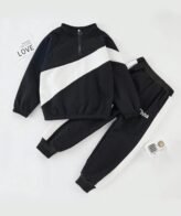 طقم ولادي مكون من قطعتين جاكيت مع قبعة وبنطلون بقبضة من الأسفل بتصميم حديث وعصري.