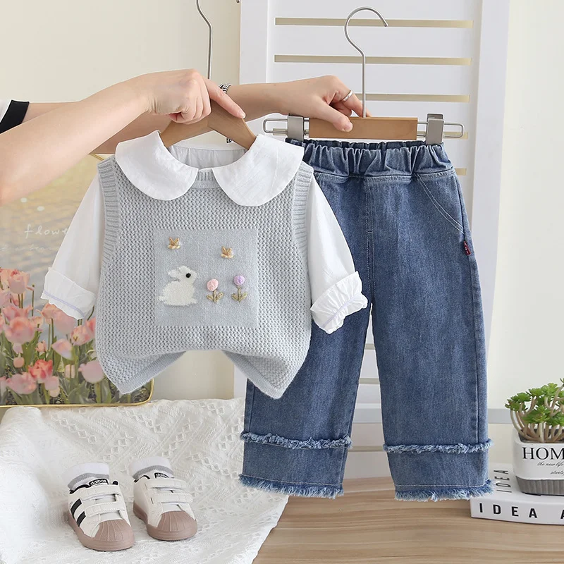 طقم بناتي يتكون من شميز بأكمام طويلة وسترة علوية بدون أكمام وبنطلون جينز للفتيات الصغيرات
