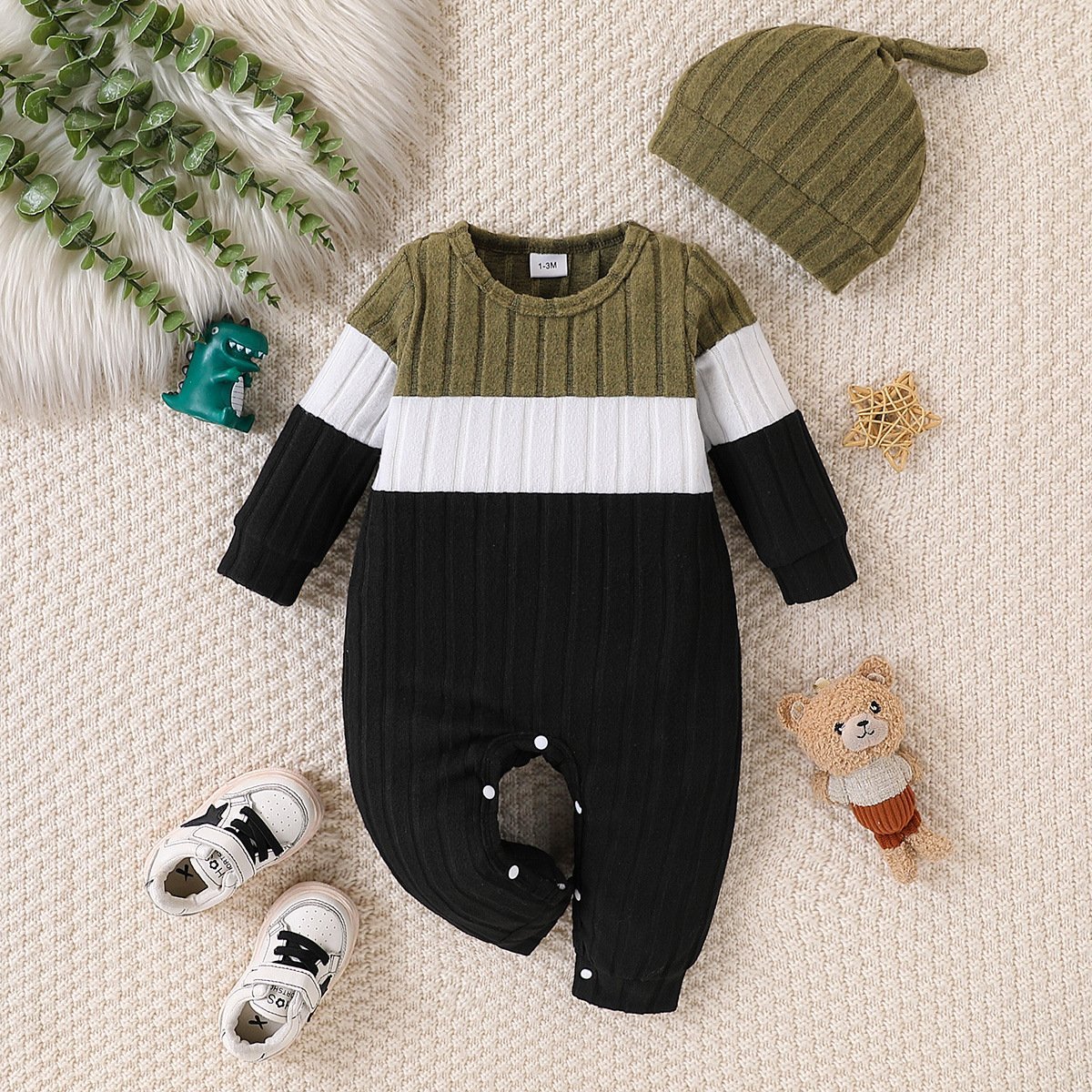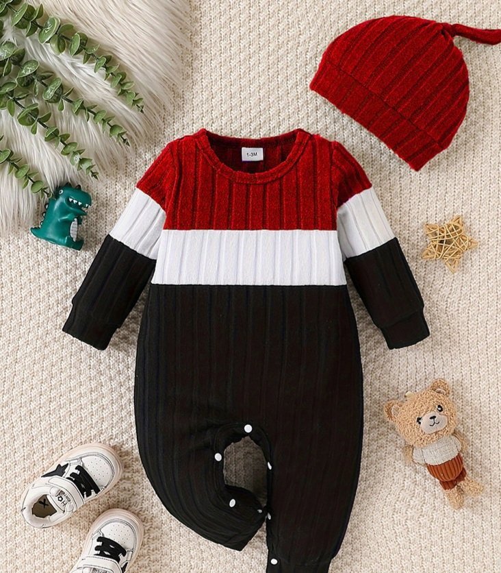 أفرول بأكمام طويلة بألوان متناسقة مع قبعة للأطفال الرضع