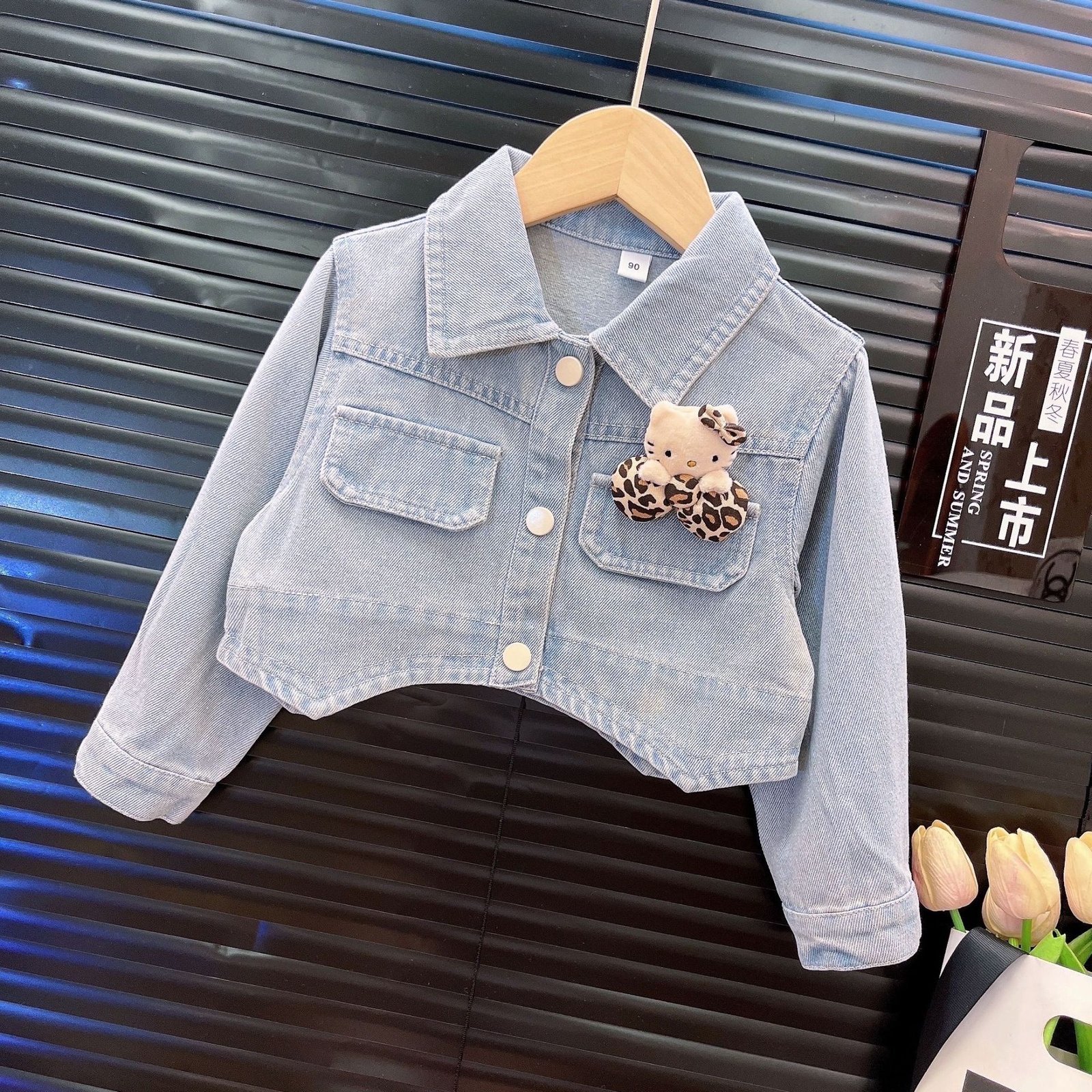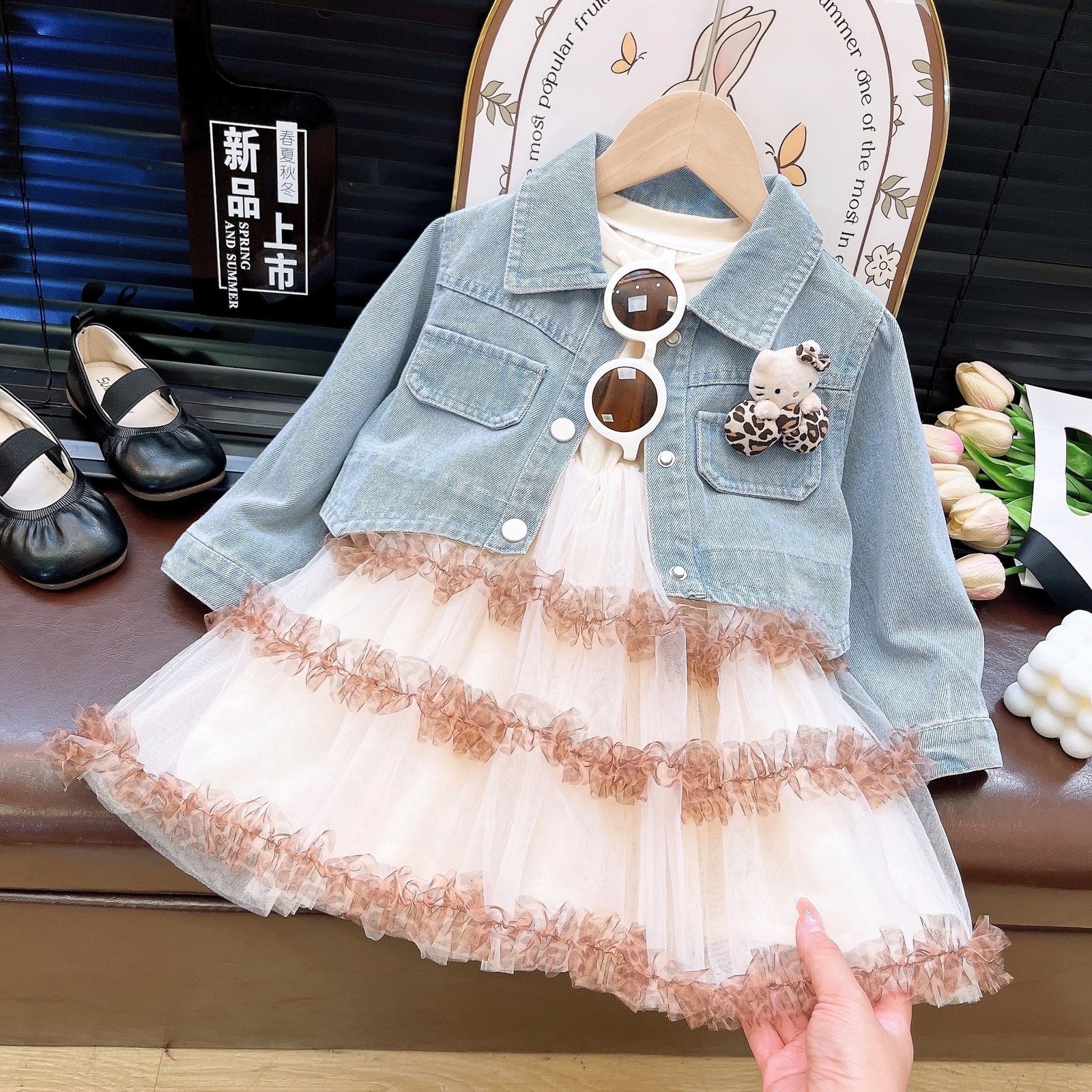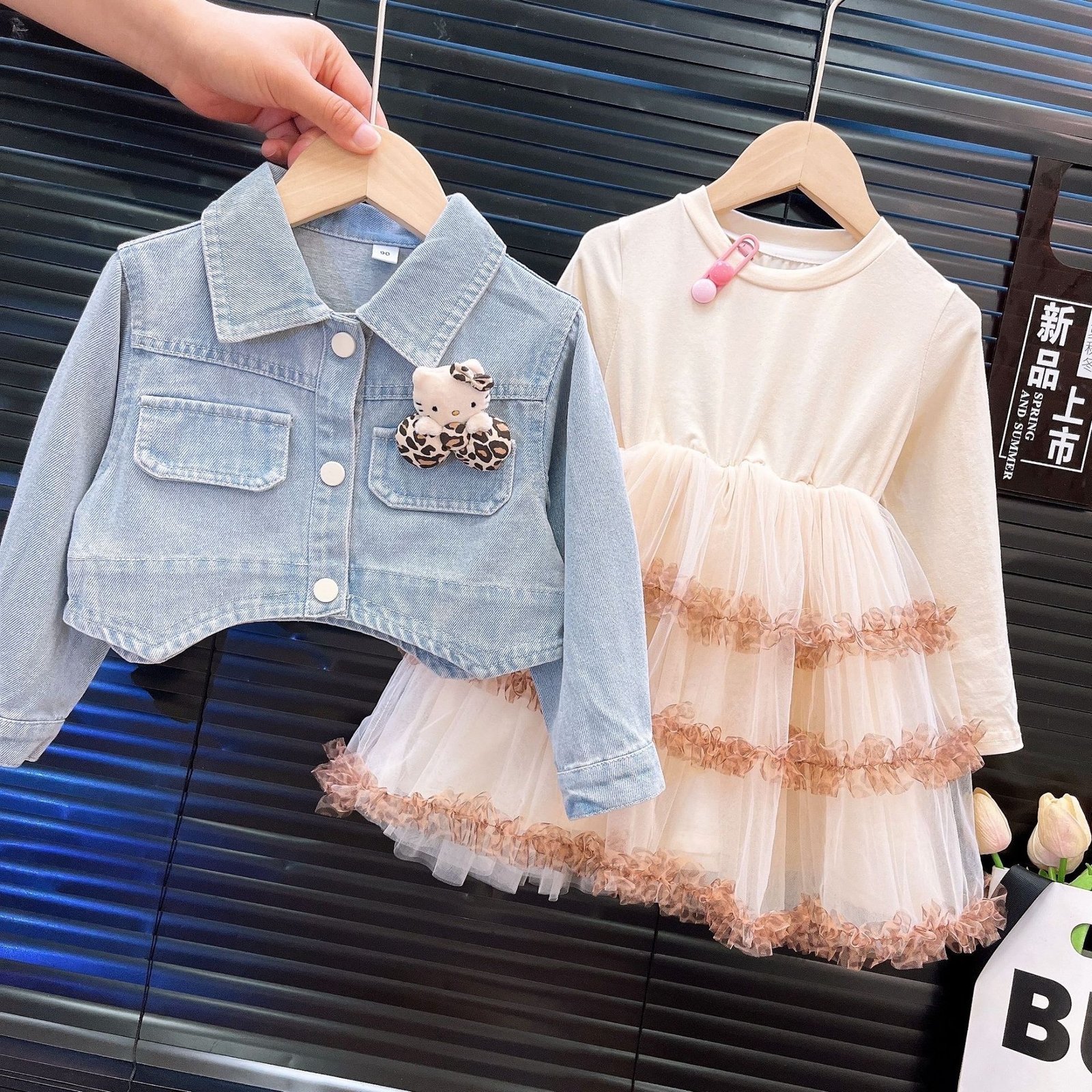 فستان بناتي بأكمام طويلة مع جاكت جينز بأكمام طويلة تصميم راقي وحديث للفتيات الصغيرات.