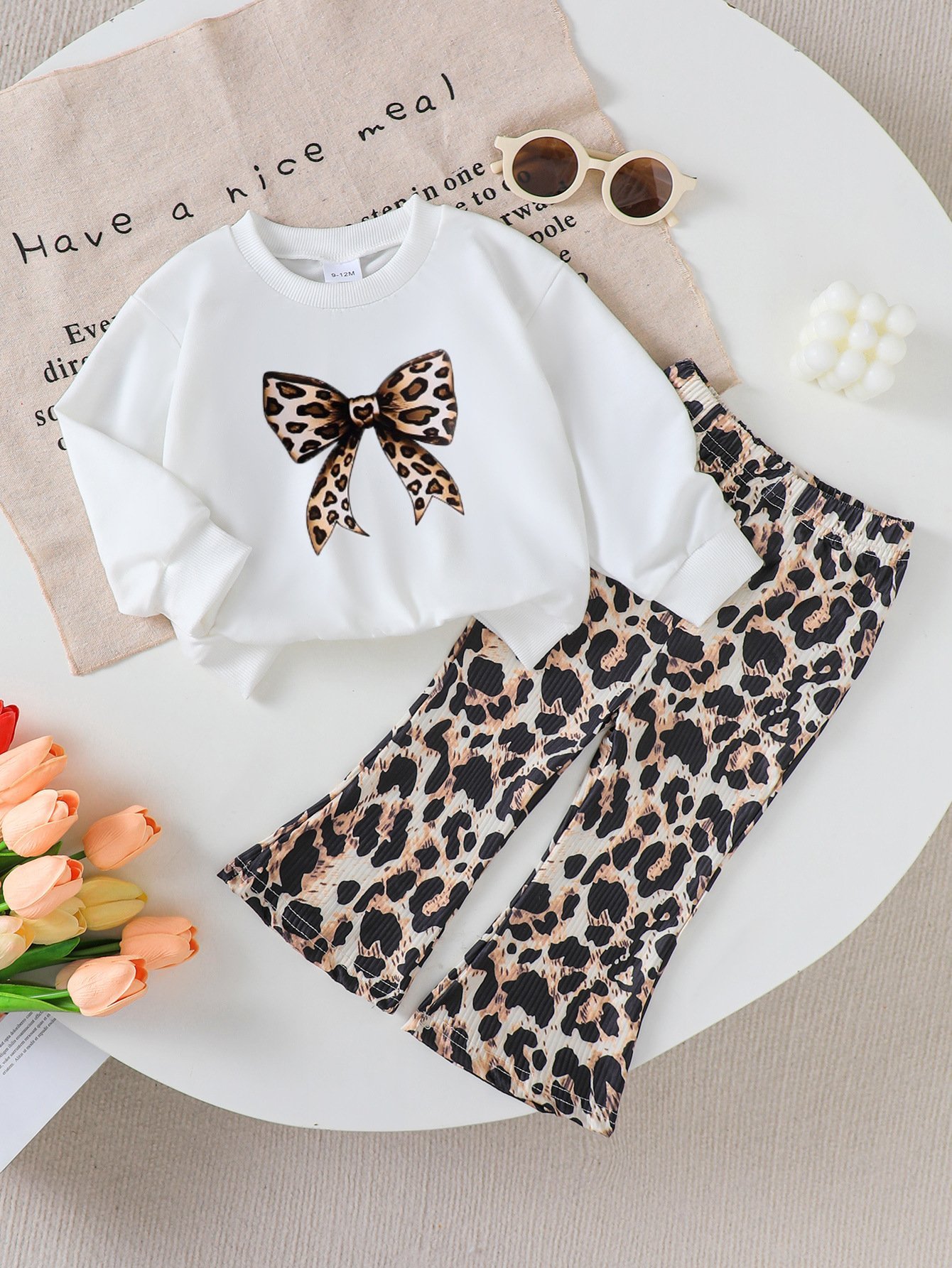 طقم بناتي يتكون من بلوزة بأكمام طويلة وبنطلون نمط نمري للفتيات الأنيقات