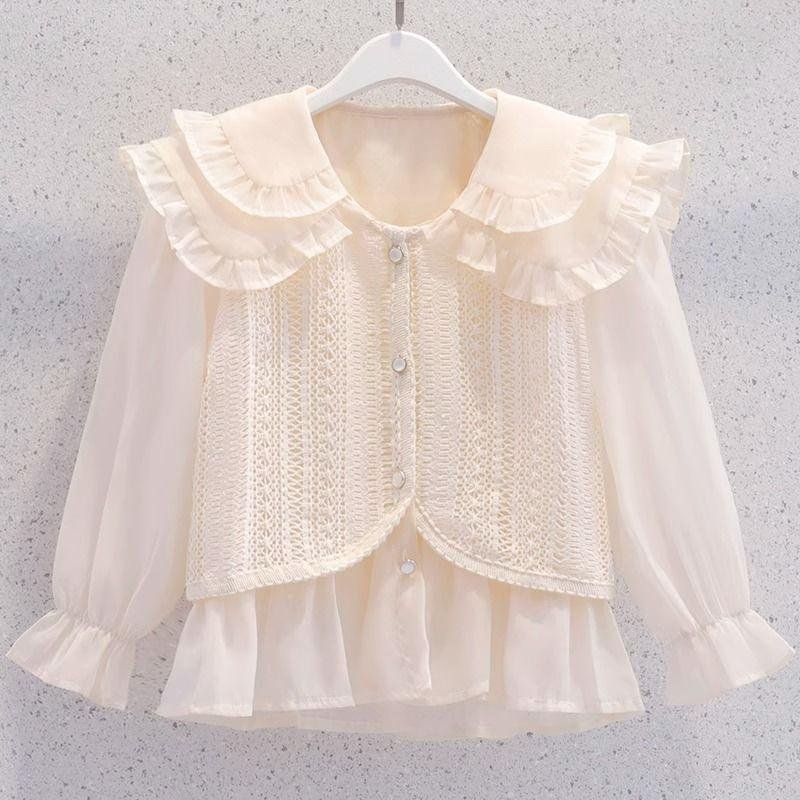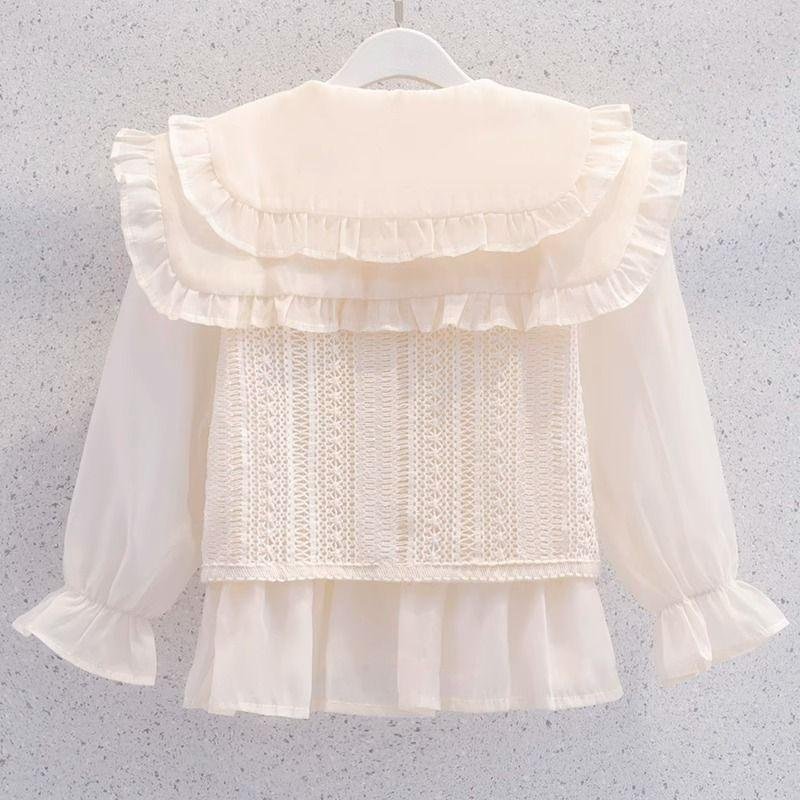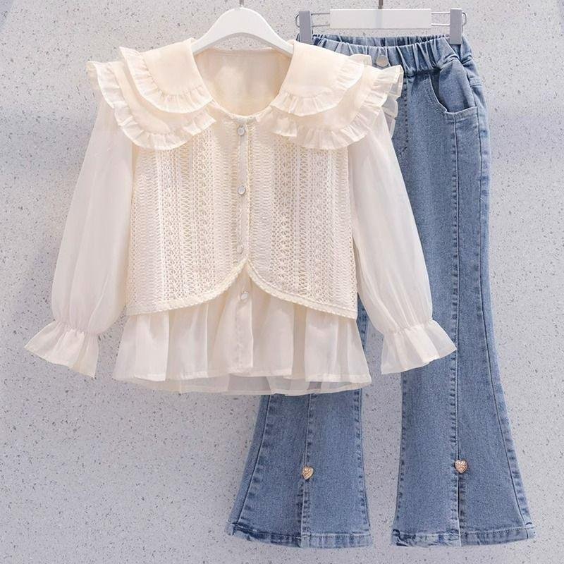 طقم بناتي يتكون من قطعتين، بلوزة بأكمام طويلة وبنطلون جينز بتصميم واسع
