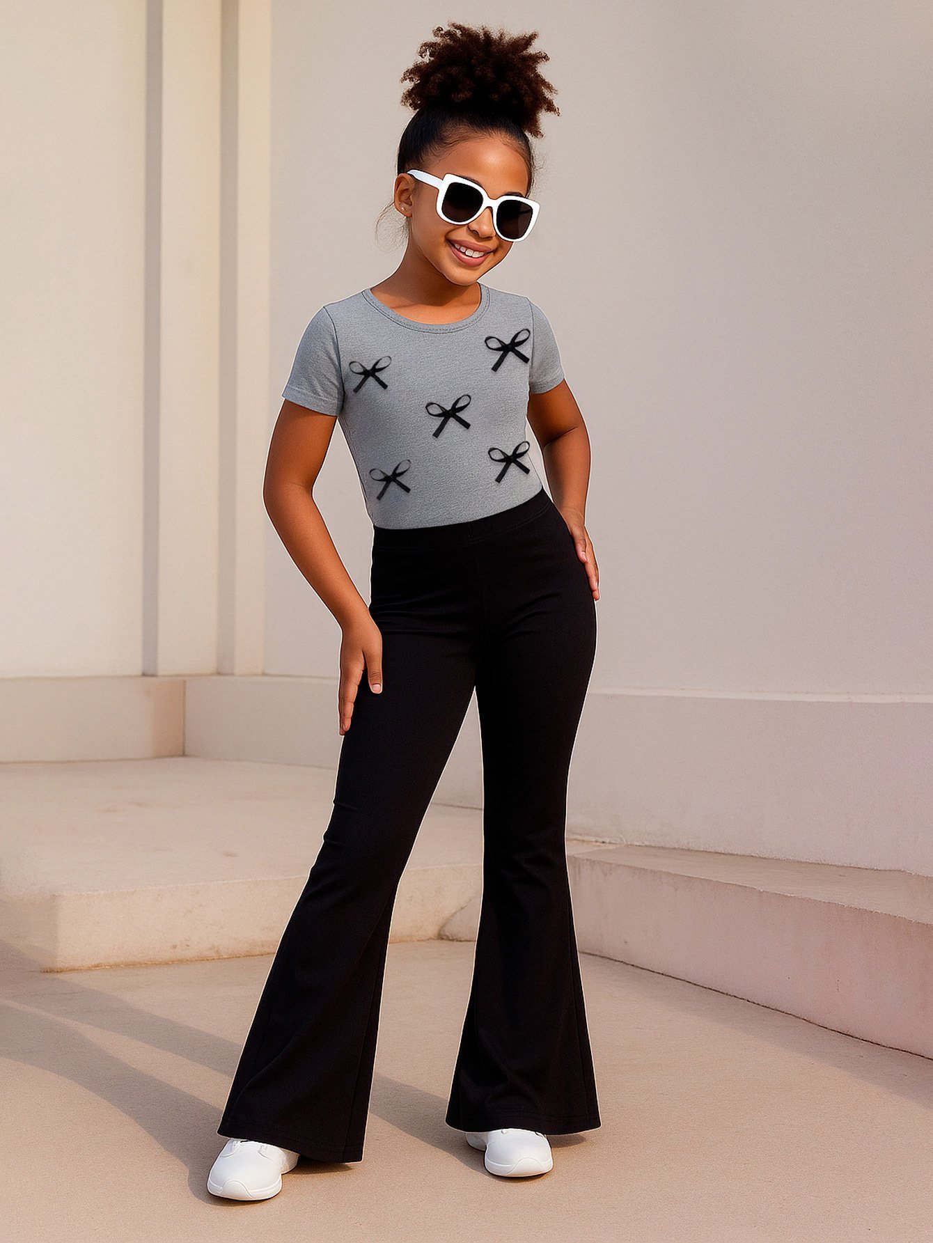 طقم بناتي أنيق مكون من قطعتين فنيلة مزينة بفيونكة أنيقة وبنطلون