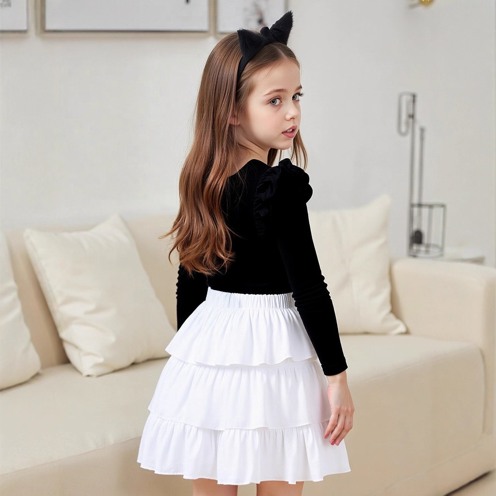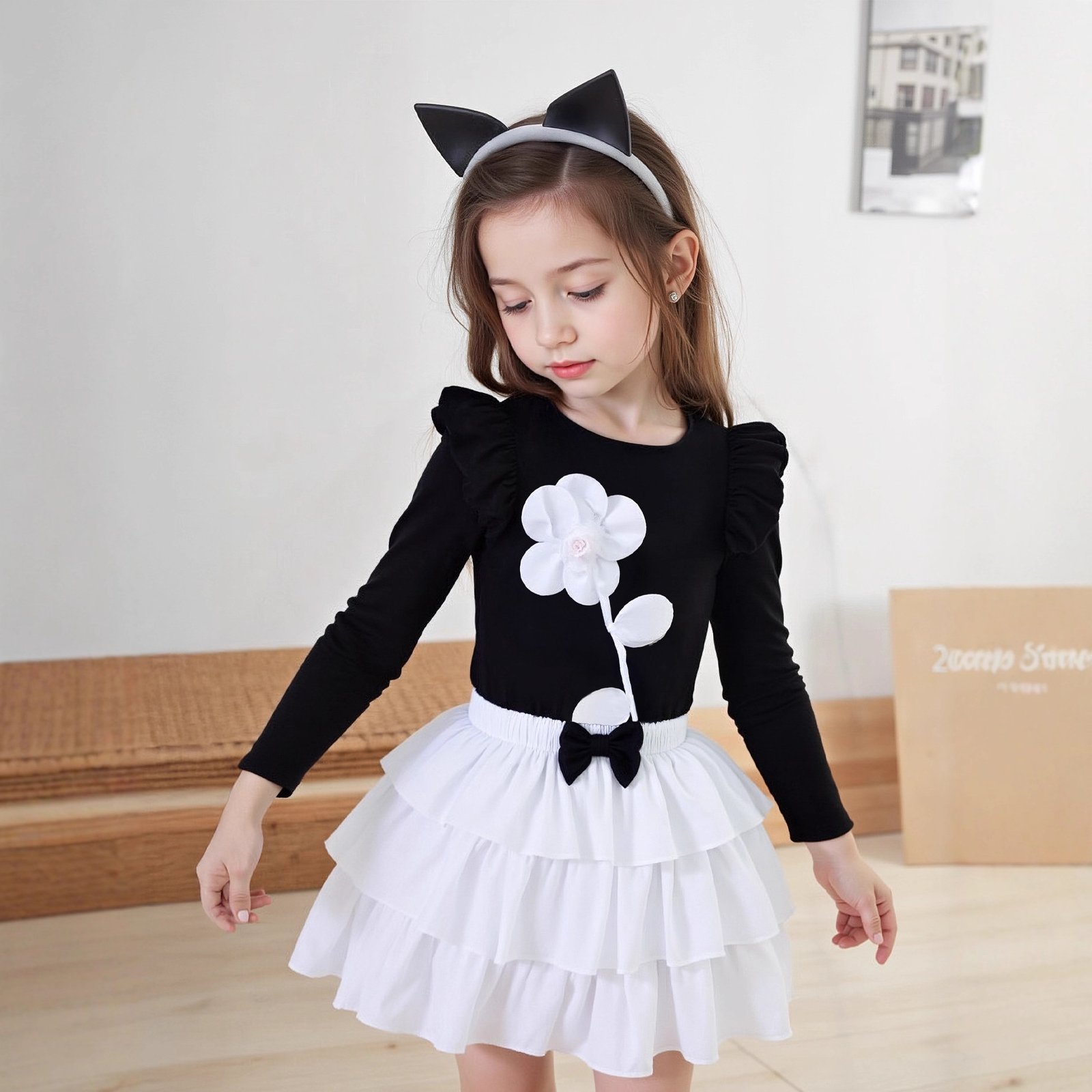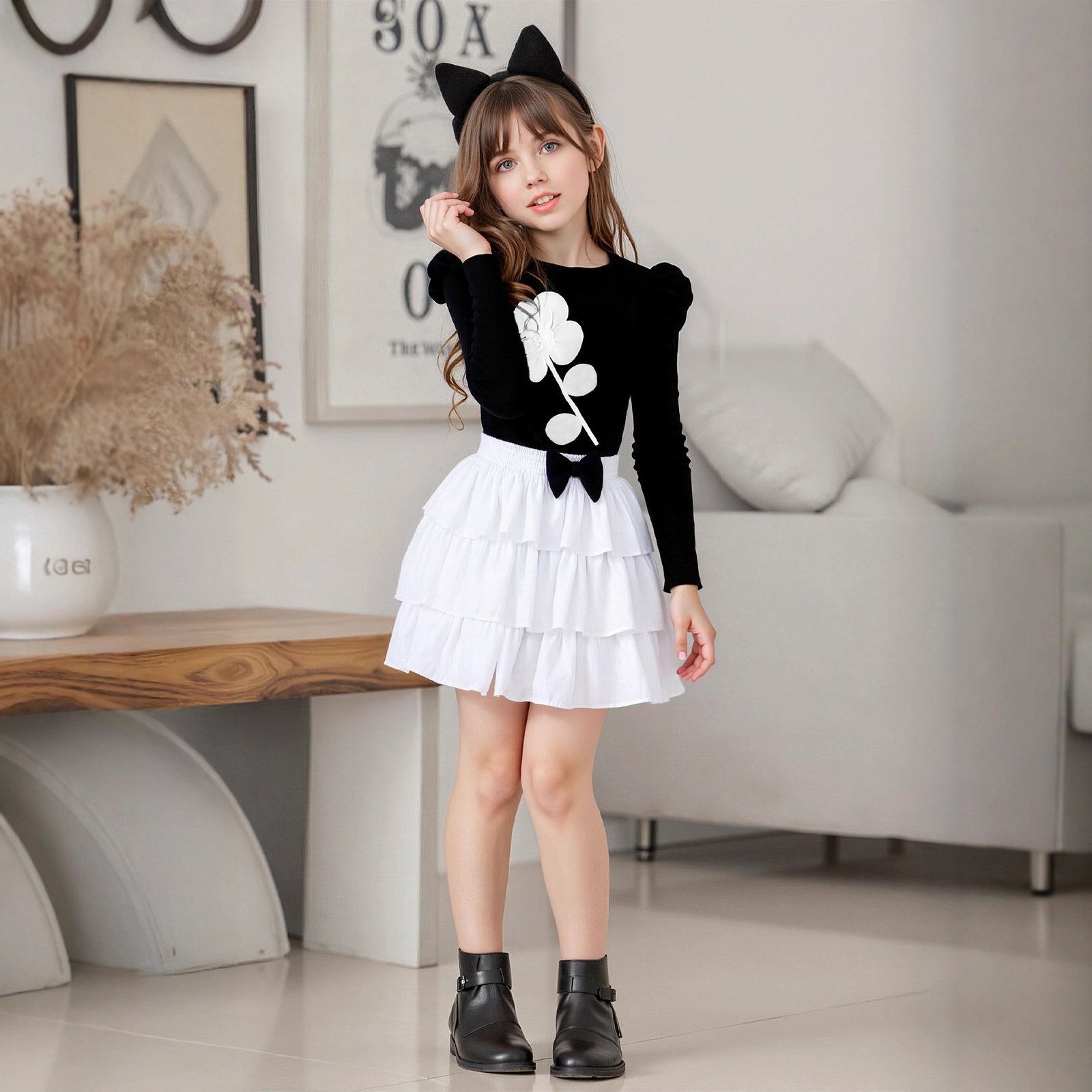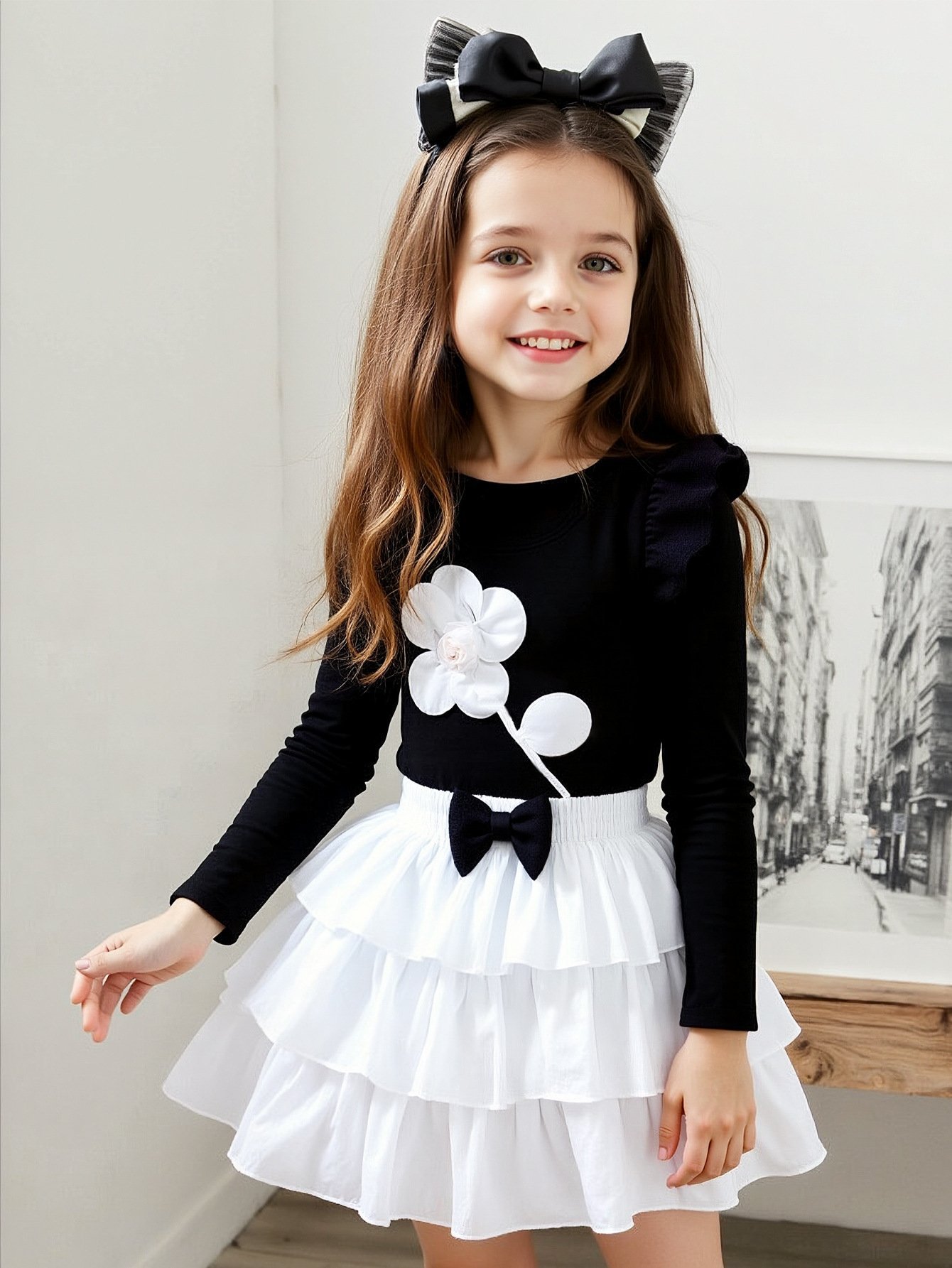 طقم بناتي يتكون من قطعتين بلوزة بأكمام طويلة وتنورة على طبقات ومزينة بفيونكة