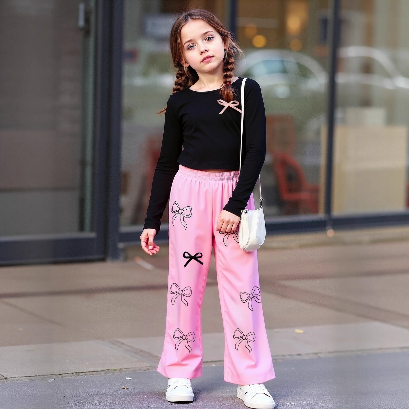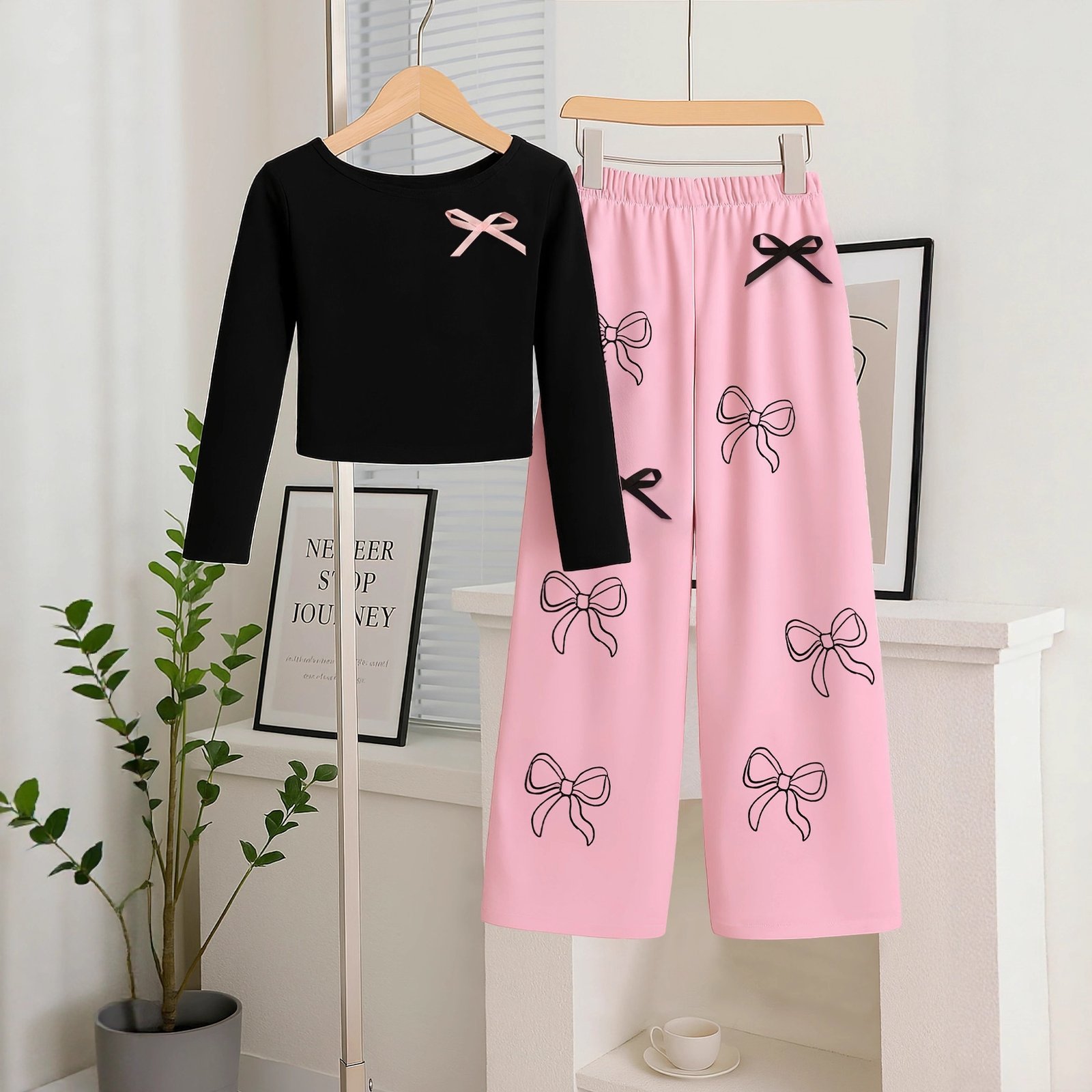 طقم بناتي يتكون من قطعتين بلوزة بأكمام طويلة وبنطلون نمط فيونكات