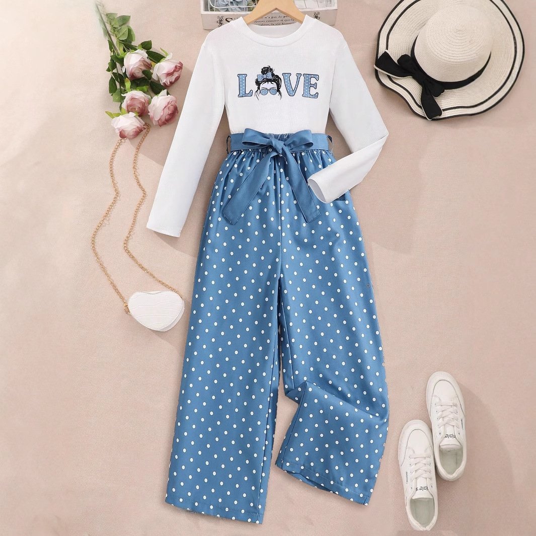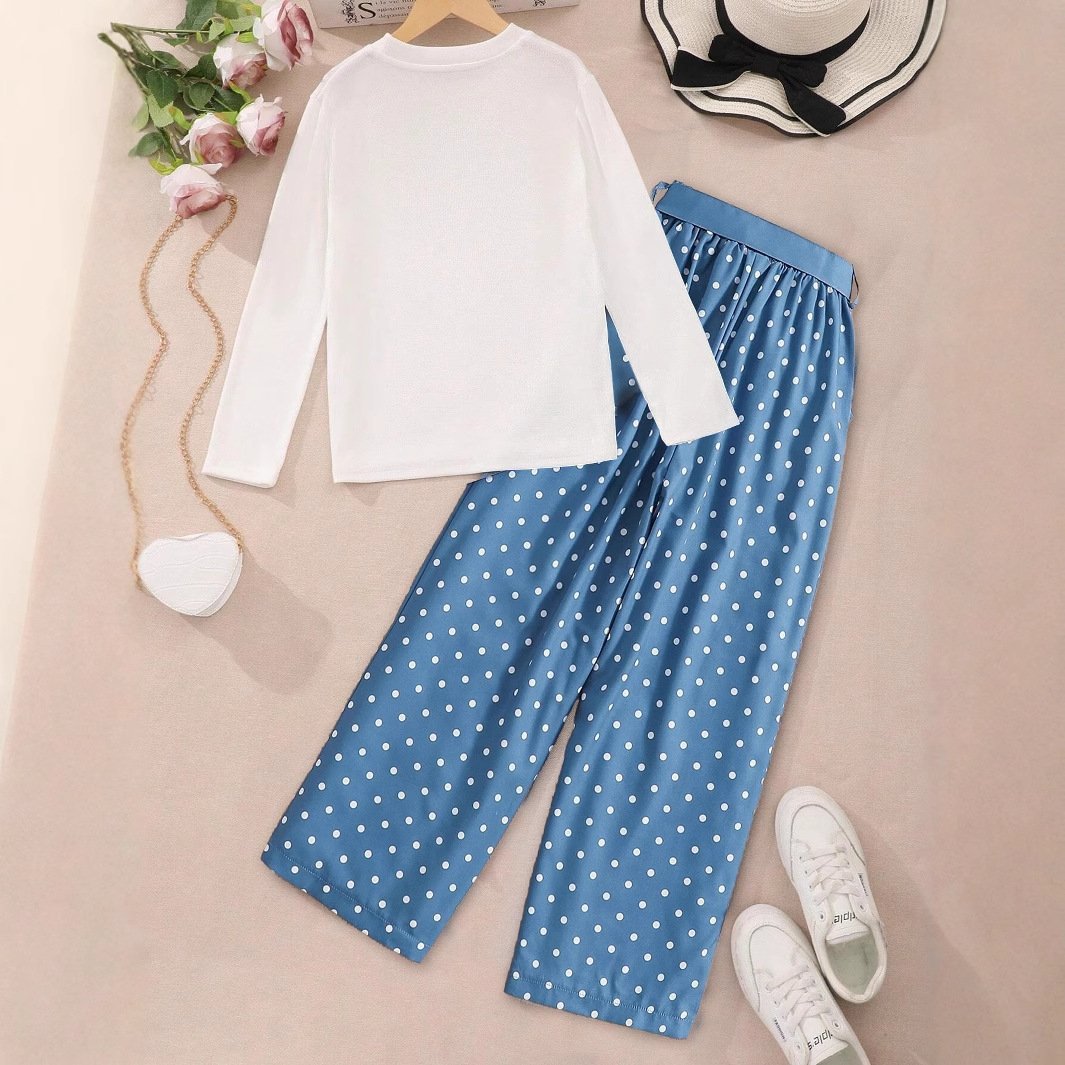 طقم بناتي يتكون من بلوزة بأكمام طويلة وبنطلون منقط بتصميم واسع مع ربطة رأس