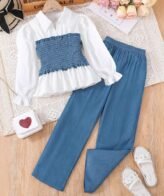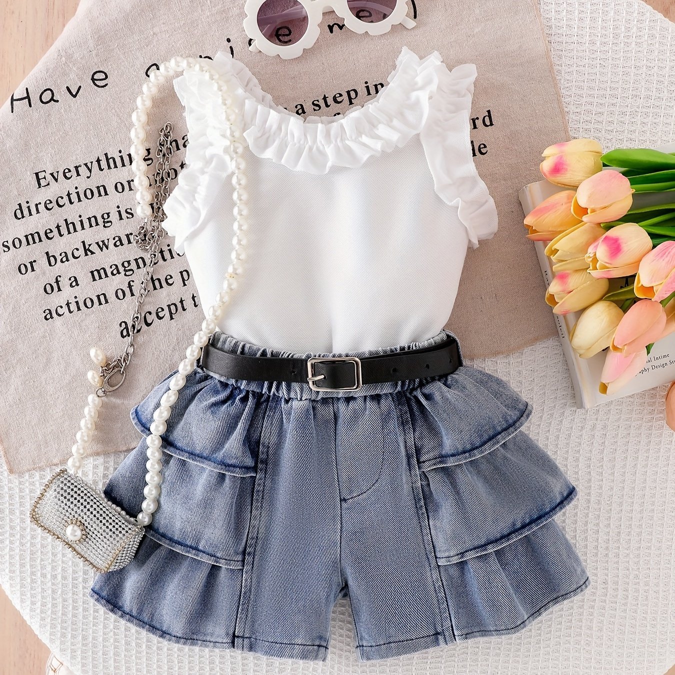 طقم بناتي قطعتين بلوزة بدون اكمام وشورت مكشكش