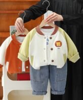 طقم ولادي يتكون من ثلاث قطع فنيلا وجاكيت بأكمام طويلة يحتوي على جيوب وبنطلون جينز