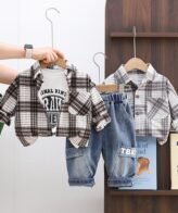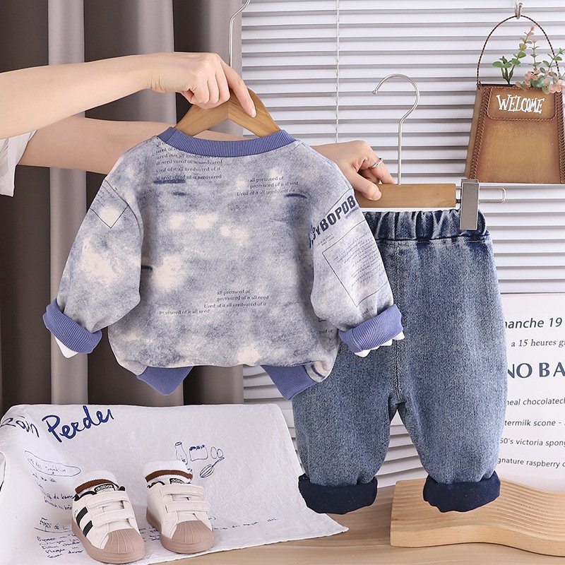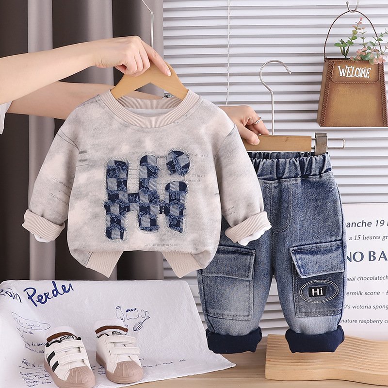 طقم ولادي يتكون من قطعتين بلوفر بأكمام طويلة وبنطلون جينز بتصميم حديث