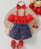 طقم بناتي يتكون من ثلاث قطع بلوزة بأكمام قصيرة وشورت نمط قلوب وربطة رأس