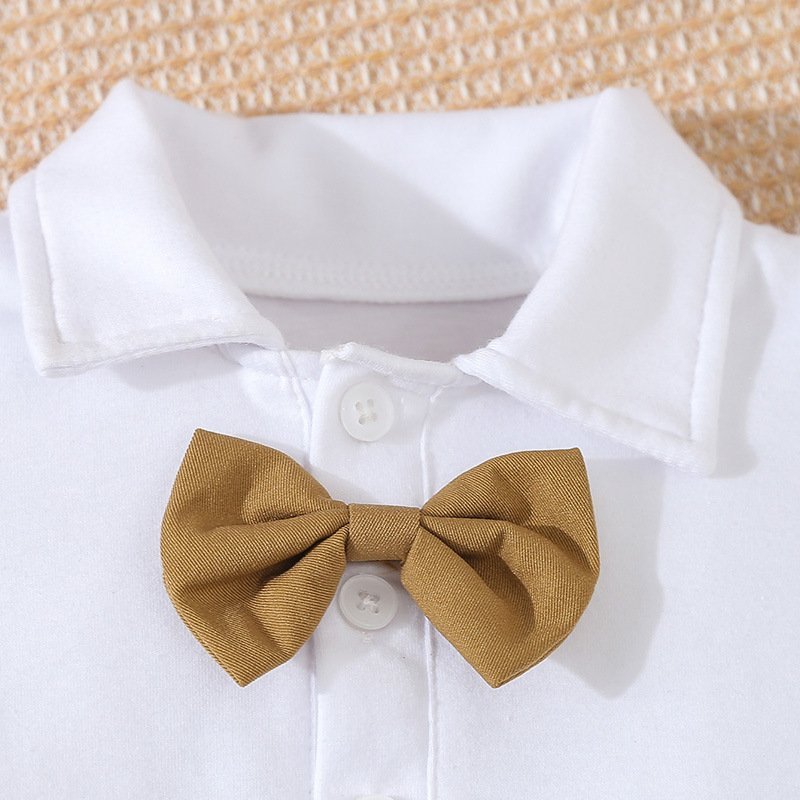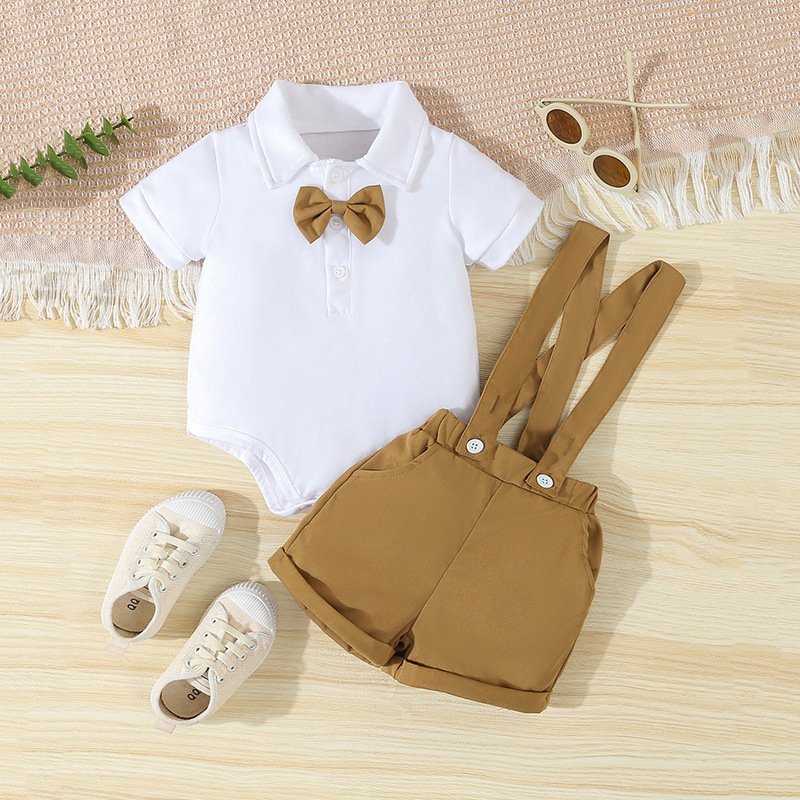 طقم مواليد ولادي يتكون من قطعتين شميز بأكمام قصيرة مزين بربطة عنق وشورت على شيال
