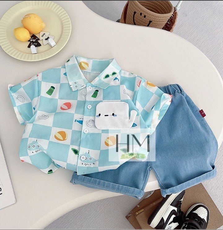 طقم ولادي مكون من شميز بأكمام قصيرة وشورت جينز بالوان زاهيه وتصميم عصري