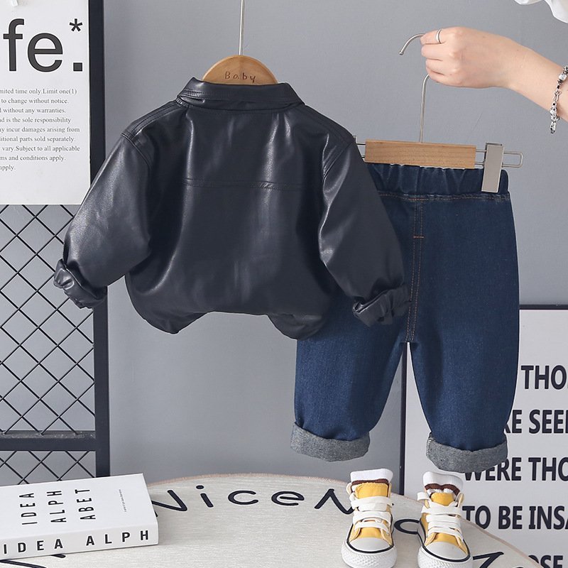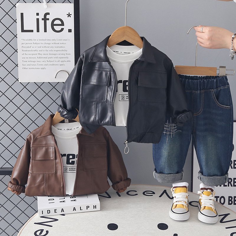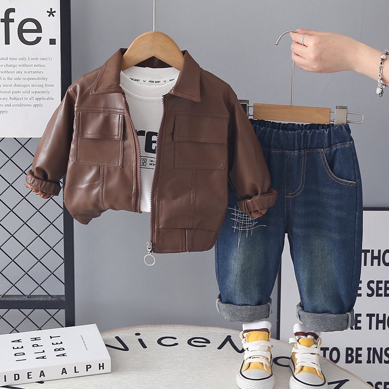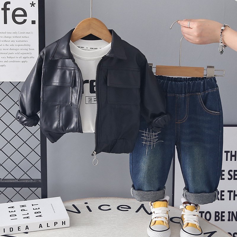 طقم ولادي يتكون من ثلاث قطع تيشيرت وجاكيت جلد بأكمام طويلة وبنطلون جينز