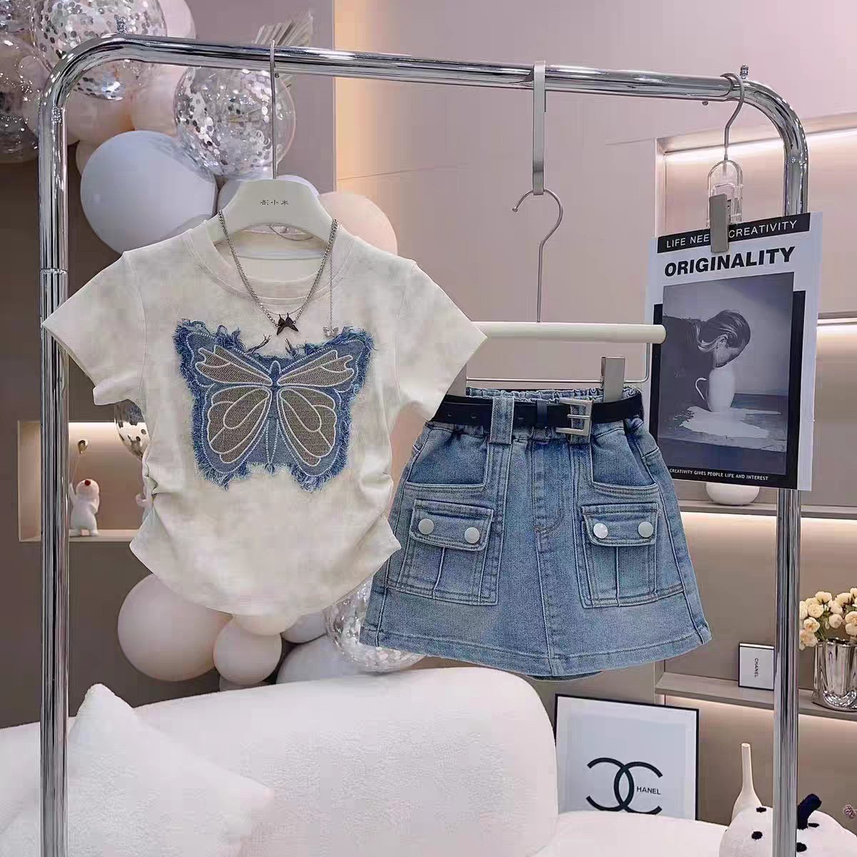 طقم بناتي يتكون من قطعتين بلوزة بأكمام قصيرة وتنورة جينز